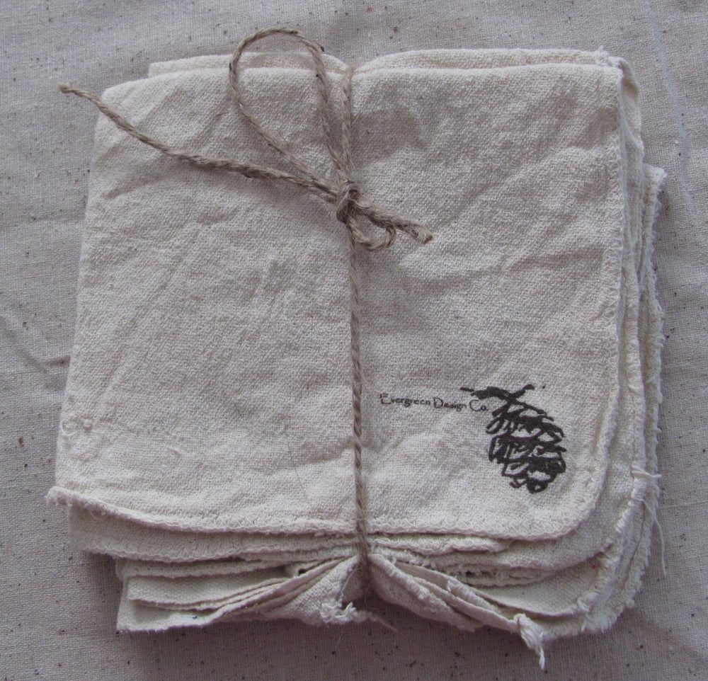 Screenprinted with love using reclaim inks, these natural shop rags are ideal for a zillion household & workshop uses. Each set includes 4 rags- each featuring a different pinecone drawing. The set is tied with a strand of jute and makes a great gift for yourself or someone else.
